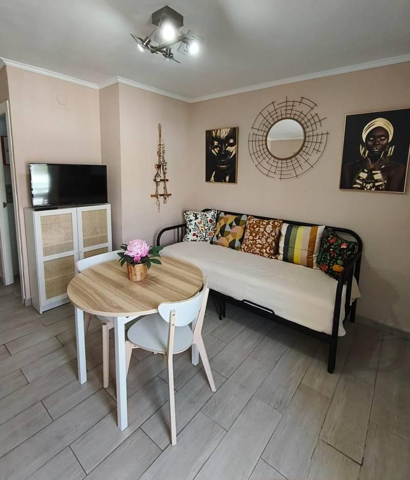 Alquilo coqueto estudio, totalmente reformado, a 3min de la playa. Aire acondicionado, cocina equipada, 2 sofás cama de matrimonio. Residencial con 3 piscinas, jardines y chiringuito. Muy cerca de Puerto Marina. Espectacular Parque de la Paloma y los mejores chiringuitos de la Costa.
